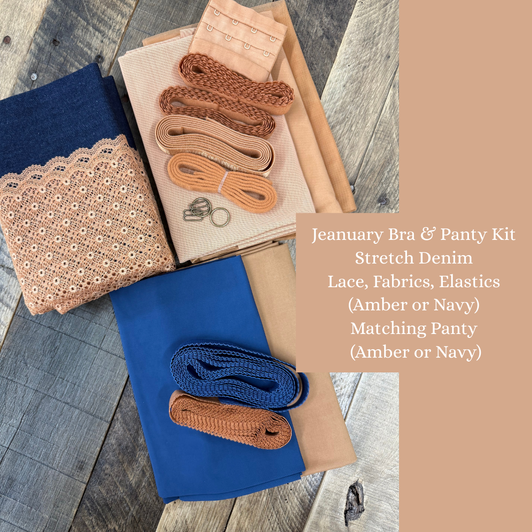 This stretch denim bra kit is a wonderful complement to those perfect pair of jeans. Along with a Kit Cut of Stretch Denim, you will receive Sheer Lining in Amber or Ink. Accent with Ink or Amber for a lovely set and don't forget a matching panty!