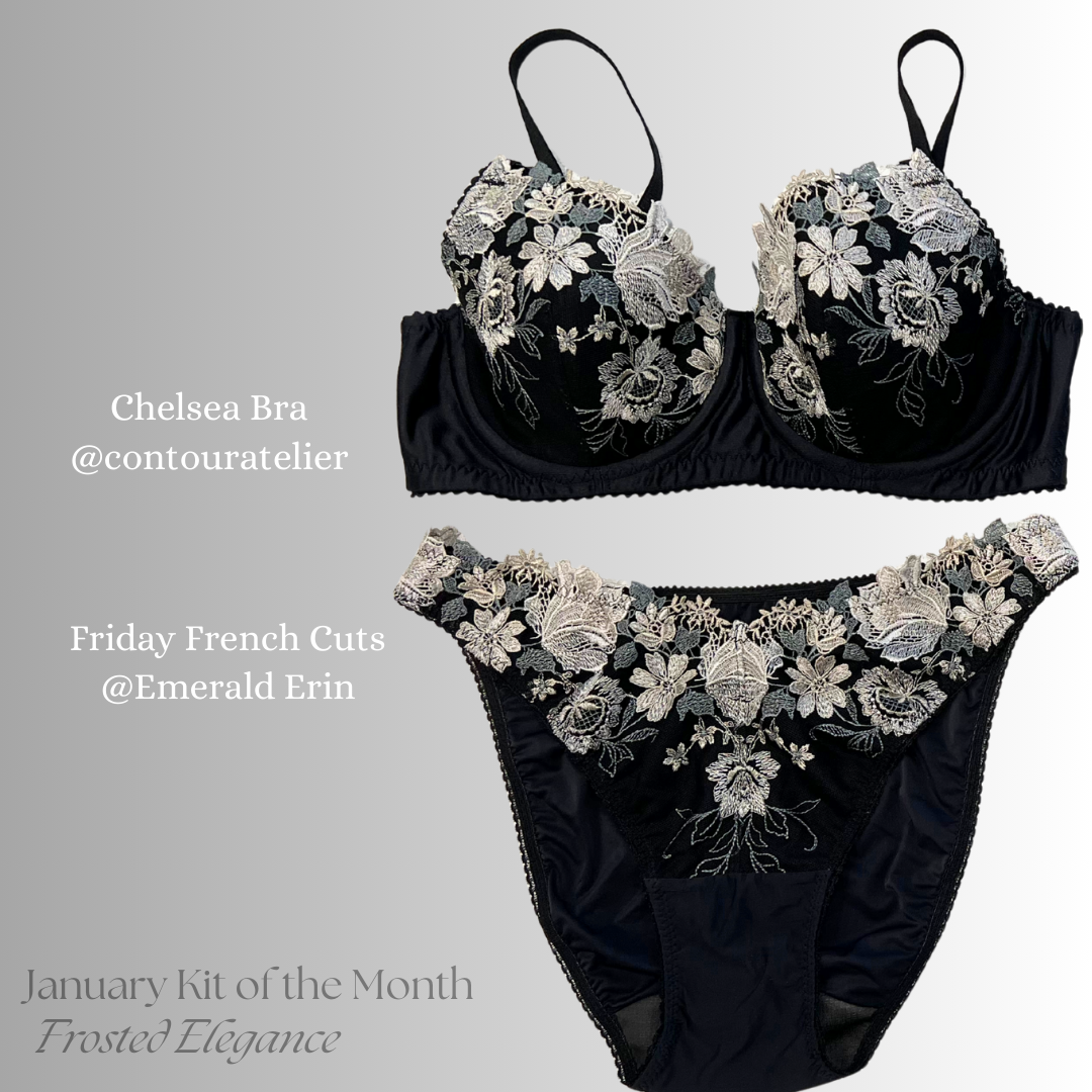 We thrive on elegance, and this lace will not disappoint as you ooh and ahh over the floral party enjoyed with "Frosted Elegance" a 9" Tulle Lace that will shine on your traditional cup/band fabrics in Dove or Midnight or gussy it up with Silk in Smoke or Midnight.