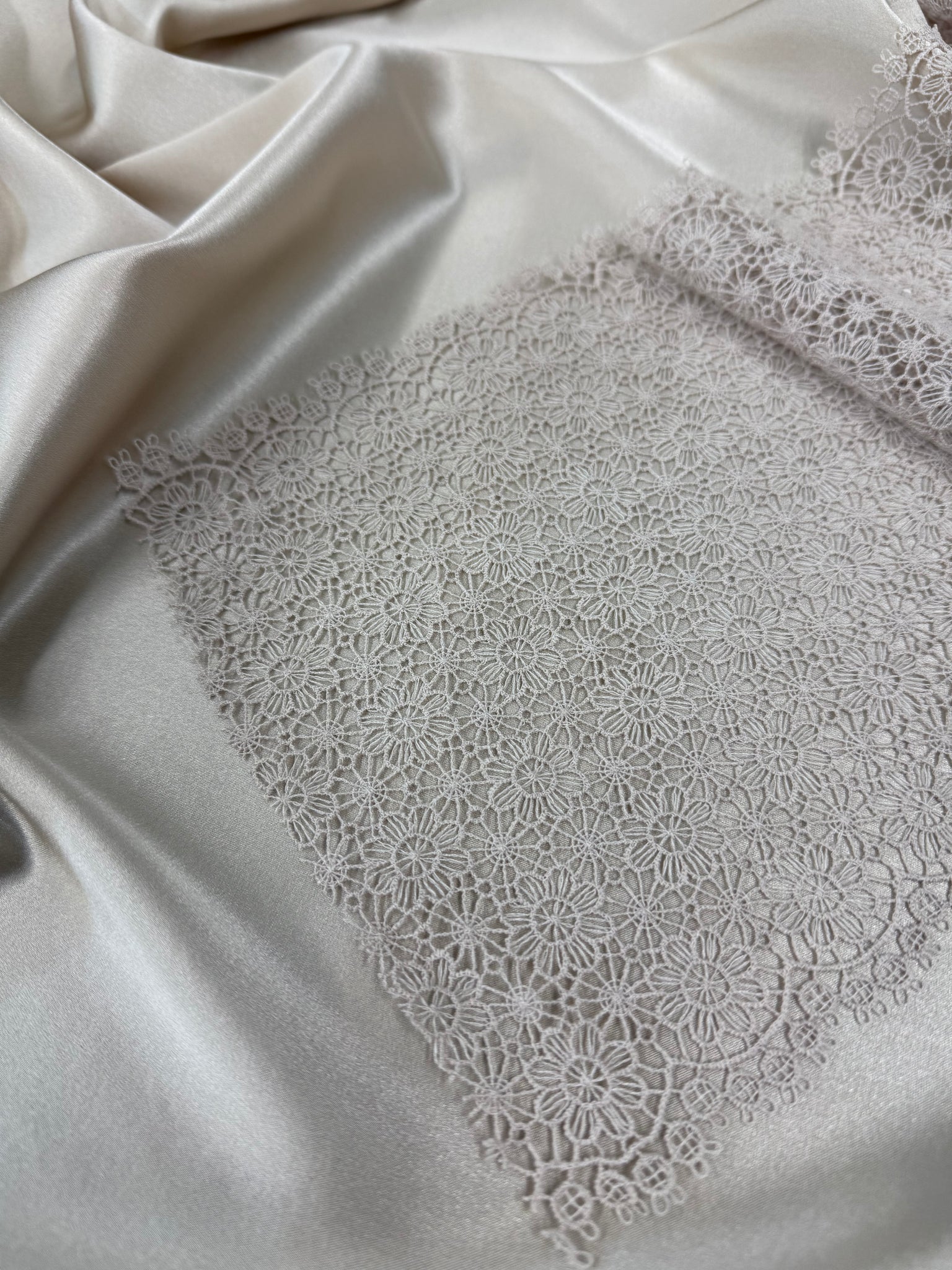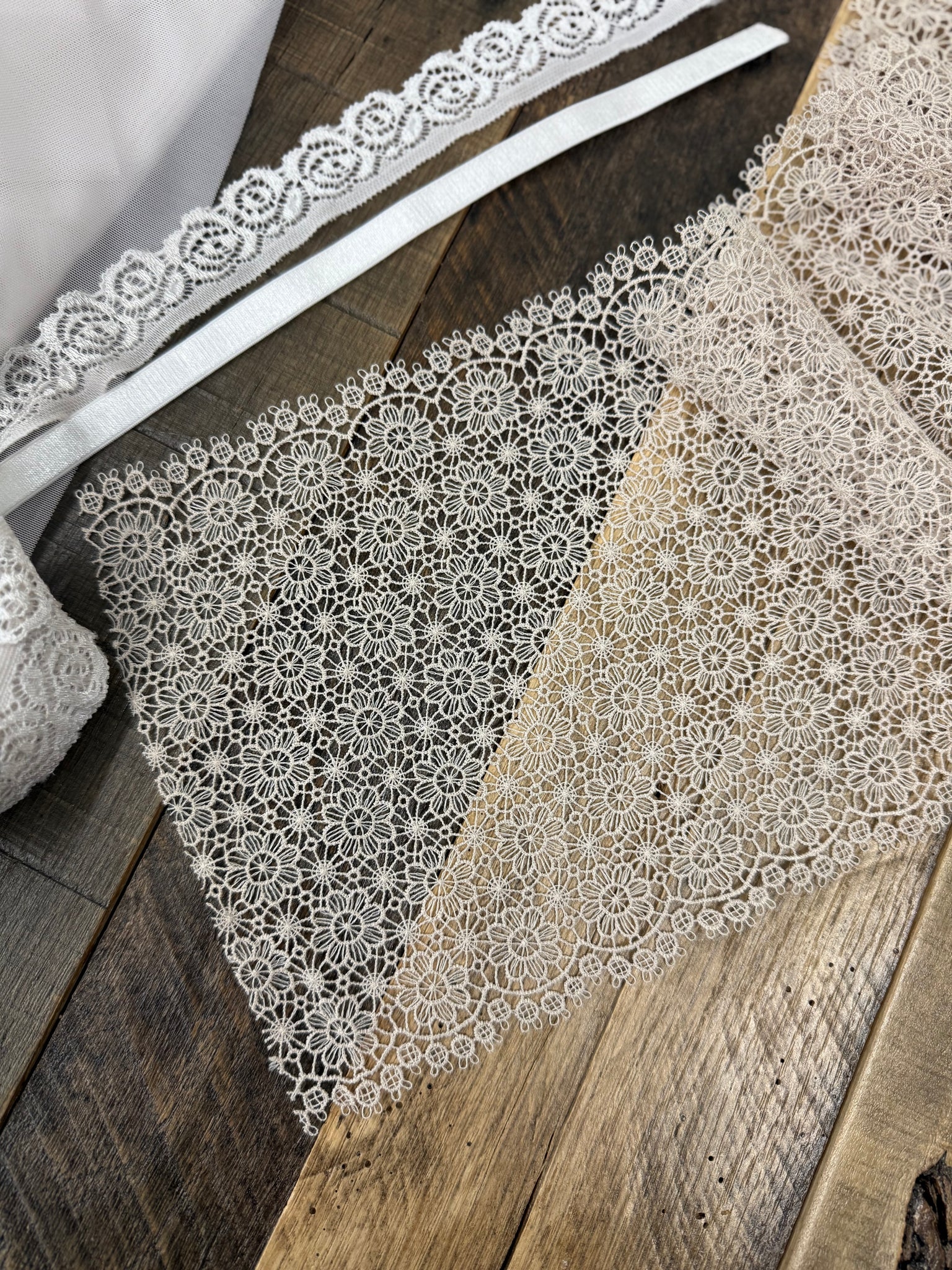Lovelace Guipere Lace has spent all year as a Kit of the Month Club Exclusive lace and is now available for all to enjoy! Lovelace is a 7" wide guipere lace supported by Dove, as well as any bold color you'd like to contrast with this neutral beauty.