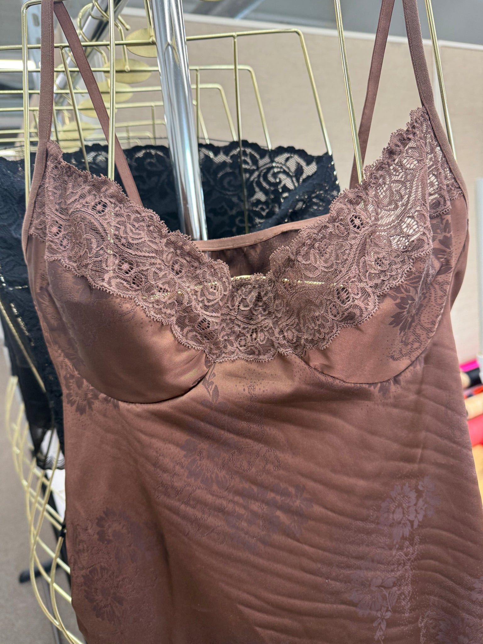 Our silky Rita Print Polyester Charmeuse is a great choice for camis, slips, robes and peignoir sets! Available in Rita's lovely garden print, supported by many colors - a Navy Blue, an Aqua Green, a lovely spring/summer Coral, and our new Vintage Brown supported by Carob.  Put either of them together with a cami and shorties and you've got a luxurious and classy lounge set. Or make your favorite non-stretch pajama pattern...perfect in Charmeuse!