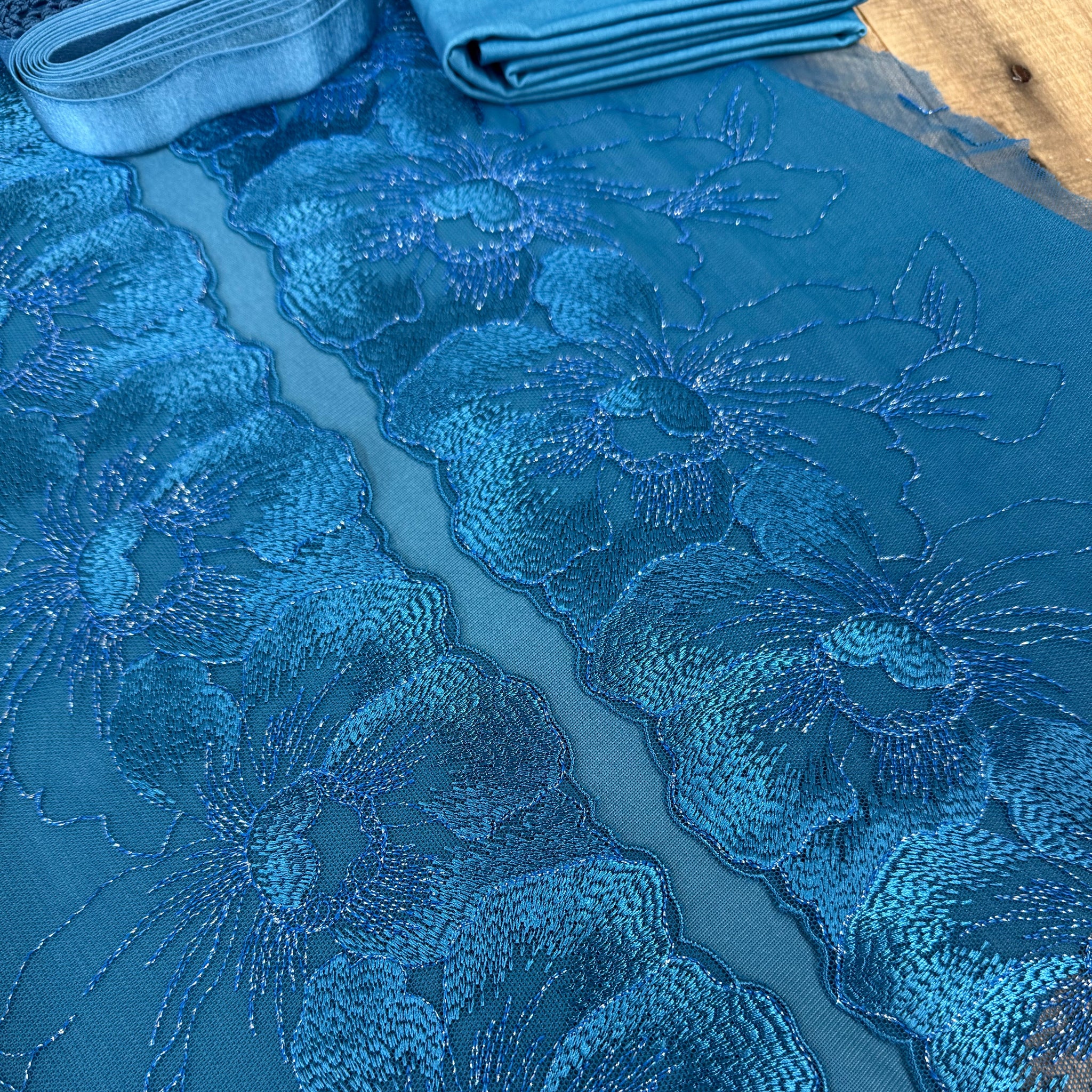 Holiday nights take on a twinkle all their own, and so does this beautiful lace bra kit in all Twilight. This mirrored lace features embroidered blooms along one edge of its fine hex-like tulle and has a little more mechanical give than many of the tulle laces we typically carry.
